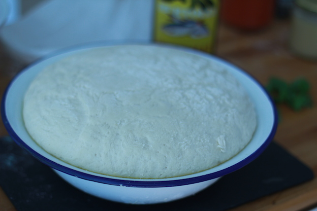 Flour a clean work surface and turn your dough out of the bowl. Knead the heck out of your dough for about 10 minutes. Daydream about eating pizza to help pass the time. Words that describe what you’re looking for: smooth, elastic, springy. This takes about 10 minutes to achieve, and your dough won’t rise if you don’t knead it for long enough, so hang in there! Stretch the dough away from you, stretch it between your hands, turn, repeat. After kneading, place the dough in a large oiled bowl, cover with a clean teatowel and leave somewhere cosy (no draughts please) until the dough has doubled in size – at least an hour.