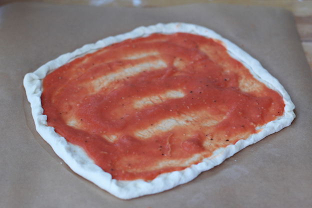 Using a blender, blend the tomatoes and garlic together and season with salt and pepper. Don’t cook the pizza sauce, it will cook on top of the pizza, and the taste will be much more vibrant (plus you save time and pots).